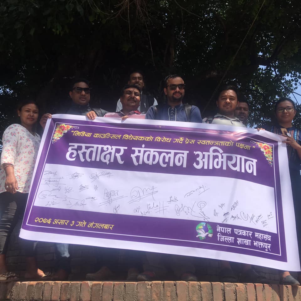 भक्तपुर, ४ असार । नेपाल पत्रकार महासंघ जिल्ला शाखा भक्तपुरले प्रेस स्वतन्त्रताको पक्षमा हस्ताक्षर संकलन अभियान सञ्चालन गरेको छ । सरकारले संसदमा दर्ता गराएको मिडिया काउन्सिल विधेयक फिर्ता लिन माग राख्दै नेपाल पत्रकार महासंघले घोषणा गरेको तेस्रो चरणको आन्दोलनको कार्यक्रम अन्तर्गत आज हस्ताक्षर अभियान संचालन गरेको हो । दुधपाटीमा संचालन गरिएको हस्ताक्षर अभियान अन्तर्गत पत्रकार,…