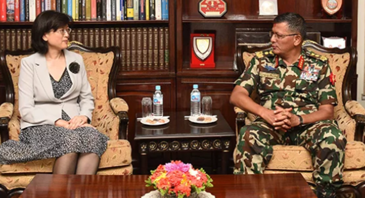 भदौ ३०, काठमाडौं । नेपालका लागि चिनियाँ राजदूत यू होङले प्रधान सेनापति महारथी पूर्णचन्द्र थापालाई बधाई दिएकी छन् । शुक्रबार राजदूत होङले सेनापति थापालाई जंगी अड्डामै पुगेर बधाई दिएकी हुन् । भेटवार्ताका क्रममा राजदूत होङ र प्रधानसेनापति थापाबीच द्विपक्षीय हित तथा पारस्परिक सम्बन्धका बिषयमा पनि छलफल भएको जनाएको छ ।