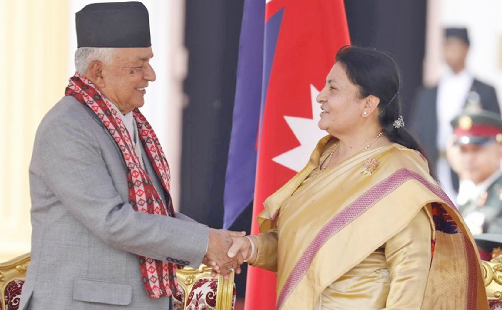 काठमाडौँ, २९ फागुन । निवर्तमान राष्ट्रपति विद्यादेवी भण्डारीको बिदाई भएको छ । आज उनलाई राष्टपादति निवास शीतलनिवासबाट बिदाई गरिएको हो । राष्ट्रपति रामचन्द्र पौडेलले पद तथा गोपनियताको शपथ लिएसँगै राष्ट्रपति भण्डारीको बिदाई गरिएको हो । उनलाई नेपाली सेनाले २१ टोपको सलामी दिएर बिदाई गरिएको छ।