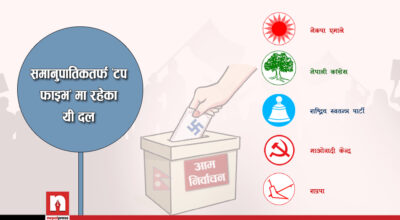 काठमाडौँ, ७ मंसिर । आइतबार सम्पन्न आम निर्वाचनको मतगणना जारी रहँदा समानुपातिकतर्फ नेकपा एमालेले अग्रता कायम राखेको छ भने नेपाली कांग्रेस दोस्रो स्थानमा रहेको छ । बुधबार बिहानको अद्यावधिक विवरणअनुसार पहिलो स्थानमा रहेको नेकपा एमालेले हालसम्म २ लाख ६ हजार ९७३ मत प्राप्त गरेको छ भने नेपाली कांग्रेसले १ लाख ८३ हजार ८० मत प्राप्त…