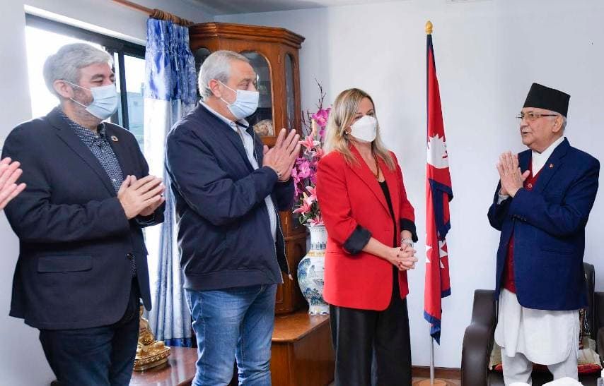 काठमाडौँ, १२ कार्तिक । नेकपा एमालेका अध्यक्ष केपी शर्मा ओलीसँग स्पेनको एस्ट्रामादुराकी सभामुख ब्लान्का मार्टिन देल्गाडोले आज शिष्टाचार भेटवार्ता गरेका छन । ६ दिने नेपाल भ्रमणका क्रममा बिहीबार काठमाडौँ आएका उनले आज अध्यक्ष ओलीसँग शिष्टाचार भेटवार्ता गरेका हुन  । यसअघि बिहीबार देल्गाडोको टोलीले पाटन दरबार स्क्वायरको भ्रमण गरेको थियो ।