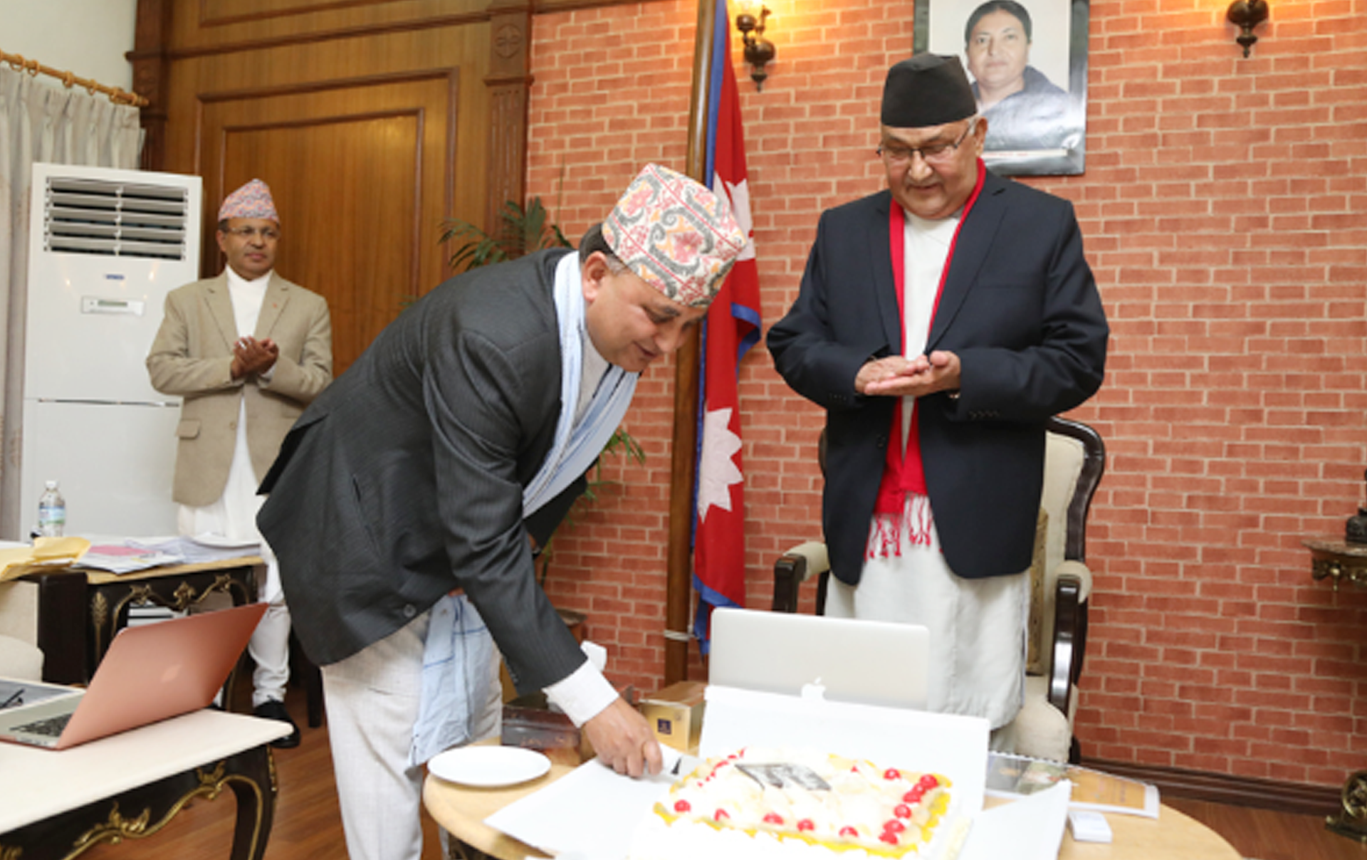 काठमाडौँ, २५ चैत । उपप्रधानमन्त्री तथा रक्षा मन्त्री ईश्वर पाेखरेलकाे जन्मदिन बालुवाटारमा एक कार्यक्रमकाबीच मनाइएकाे छ । सोमबार अपरान्ह बालुवाटारमा प्रधानमन्त्री केपी शर्मा ओलीले पुष्प गुच्छासहित केक खुवाएर पोखरेललाई जन्मदिनको शुभकामना दिएका छन । बालुवाटारमा बोलाइएको मन्त्रिपरिषद बैठकको सुरुमै प्रधानमन्त्रीले केक काटेर उपप्रधानमन्त्री पोखरेललाई खुवाएका थिए । उक्त बैठकमा उपस्थित सबै मन्त्रीहरुले पोखरेललाई जन्मदिनको शुभकामना दिएका थिए…