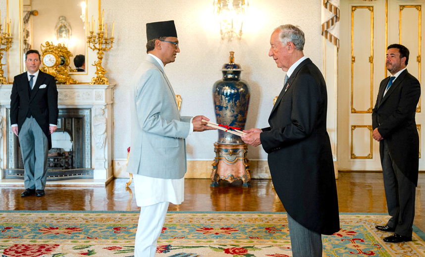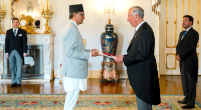 काठमाडौँ, १९ चैत । पोर्चुगलका लागि नवनियुक्त नेपाली राजदूत प्रकाशमणि पौडेलले राष्ट्रपति मार्सेलो रेबेलो डी सौसासमक्ष ओहोदाको प्रमाणपत्र पेस गरेका छन् । लिस्बनस्थित राष्ट्रपति भवन बेलेम प्यालेसमा सोमबार आयोजित एक समारोहबीच राजदूत पौडेलले राष्ट्रपति सौसासमक्ष आफ्नो ओहोदाको प्रमाणपत्र पेस गरेका हुन् । ओहोदाको प्रमाणपत्र बुझाएपछि राजदूत पौडेलले राष्ट्रपतिसँग शिष्टाचार भेटवार्ता गरेका थिए । सो अवसरमा…